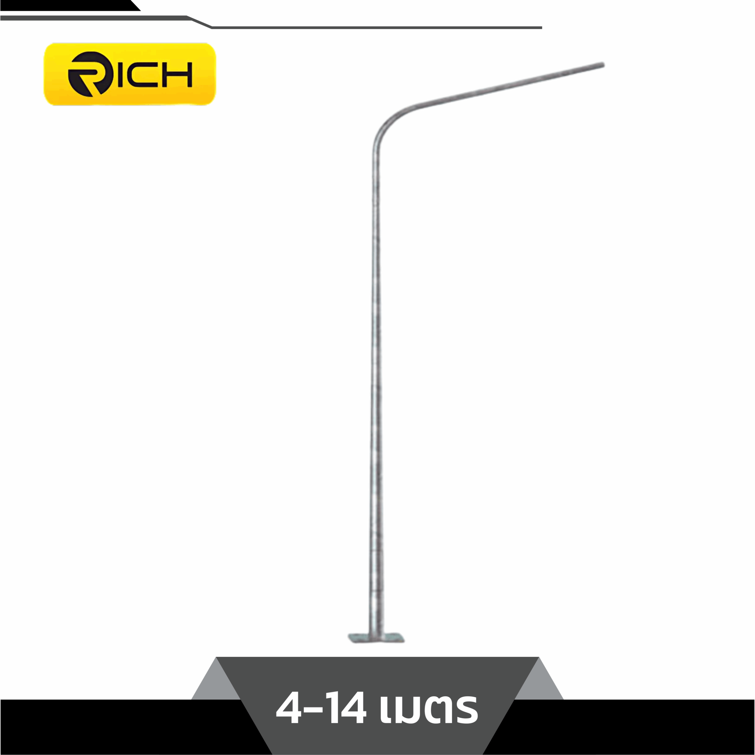 เสาไฟถนนชุบกัลวาไนซ์ ชนิดกิ่งเดี่ยวเสาไฟถนน ชนิดกิ่งเดี่ยว ตัวเสาไฟ เสาไฟถนน มีความสูงให้เลือก ตั้งแต่ 4เมตร , 5เมตร , 6เมตร , 7เมตร , 8เมตร , 9เมตร , 10เมตร , 11เมตร , 12เมตร และสูงสุด14เมตร มีการป้องกันการเกิดสนิม โดยการนำเสาไฟชุบด้วยกัลวาไนซ์อย่างดี โดยมาตรฐานระบบชุบกัลวาไนซ์ ASTM A123-89a เหมาะสำหรับติดตั้งโคมไฟนอกอาคาร มีมาตรฐานมอก. 2316-2549