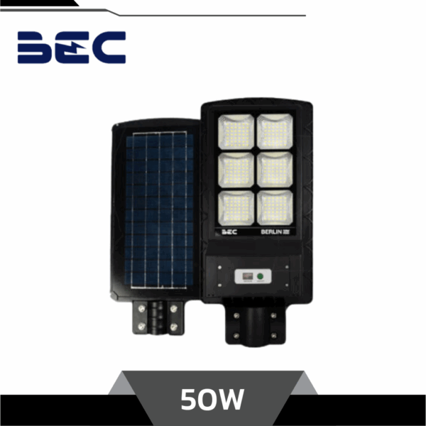 โคมไฟถนนโซล่าเซลล์ LED 50W BEC BERLIN แสงขาว Daylight 6500K เทคโนโลยีใหม่แห่งการประหยัดพลังงาน ด้วยการใช้พลังงานแสงอาทิตย์แทนพลังงานไฟฟ้า ติดตั้งง่าย ไม่ต้องเดินสายไฟ มาพร้อมระบบควบคุมการใช้งานผ่านรีโมทคอนโทรล วัสดุทนทานแข็งแรง เปิดให้แสงสว่างได้นานมากกว่า 12 ชั่วโมง (Auto mode) สามารถใช้กลางแจ้งได้ เหมาะสำหรับใช้บริเวณทางเดิน สนาม ถนนหมู่บ้าน