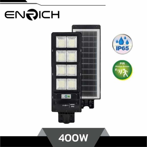 โคมไฟถนนโซล่าเซลล์ LED 400W ENRICH SUNLIGHT เป็นผลิตภัณฑ์ โซล่าเซลล์แบบ ALL IN ONE ซึ่งตัว ” แผงโซล่า ” จะรวมกับตัว ” โคมไฟถนน ” โดยภายใน SERIES นี้จะถูกผลิตชึ้นมาคือ 200วัตต์,300วัตต์,400วัตต์,600วัตต์,800วัตต์, และ 1000วัตต์ โคมไฟถนนโซล่าเซลล์ LED รุ่นนี้ ได้มีการพัฒนาเทคโนโลยีการส่องสว่างให้มีประสิทธิภาพมากขึ้น โดยเปลี่ยนการใช้พลังงานจากแสงอาทิตย์โดยตรง มาประจุพลังงานไว้ที่แบตเตอรี่แทน เพื่อช่วยประหยัดค่าไฟ ช่วงกลางวัน โคมไฟจะไม่ทำงาน เพื่อเก็บพลังงานจากแสงอาทิตย์ช่วงกลองคืน เมื่อถึงเวลากลางคืนโคมไฟจะเปิดไฟ และ หรี่แสงลงอัตโนมัติ เมื่อตรวจพบความเคลื่อนไหวในระยะ 6-8 เมตร เพราะมี ระบบ Motion Senser โคมไฟจะปรับแสงระดับความสว่างเป็น 100% โดยอัตโนมัติ และ ถ้าหากไม่มีวัตถุเคลื่อนไหวผ่านโคมเป็นเวลา 20 วินาที ตัวโคมจะค่อยๆหรี่ไฟลงเพื่อประหยัดพลังงาน